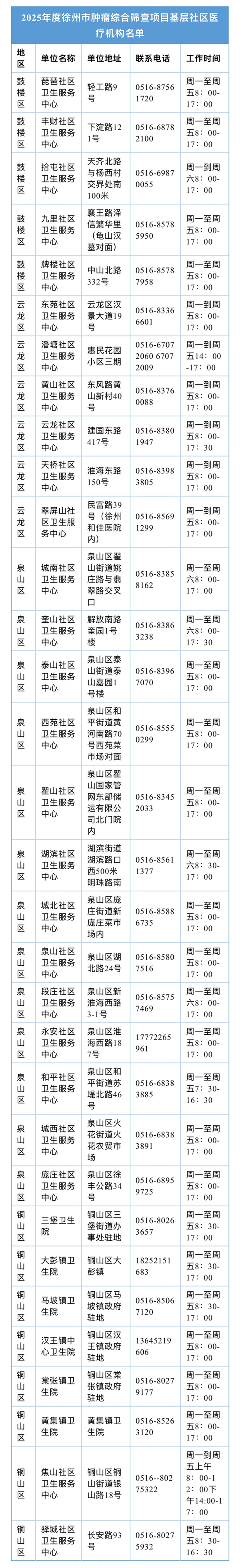 本次筛查将在主城区(鼓楼区、云龙区、泉山区、铜山区)部分社区卫生服务中心开展,符合条件的居民可以就近前往了解详情,具体开展机构如下: